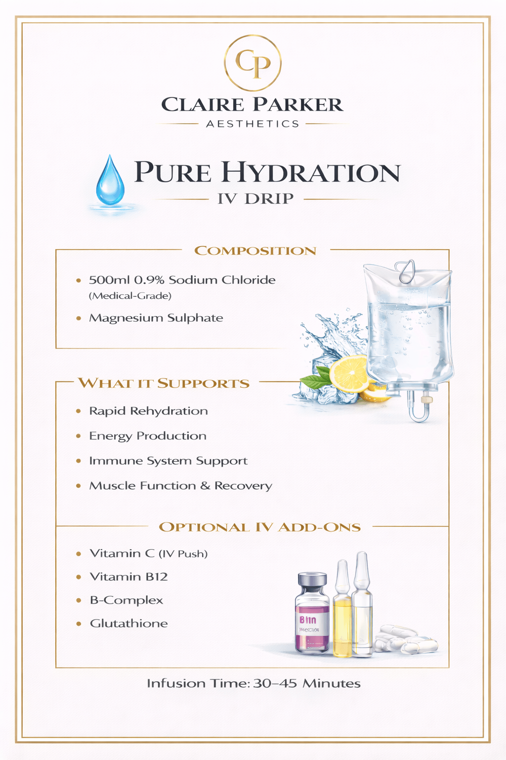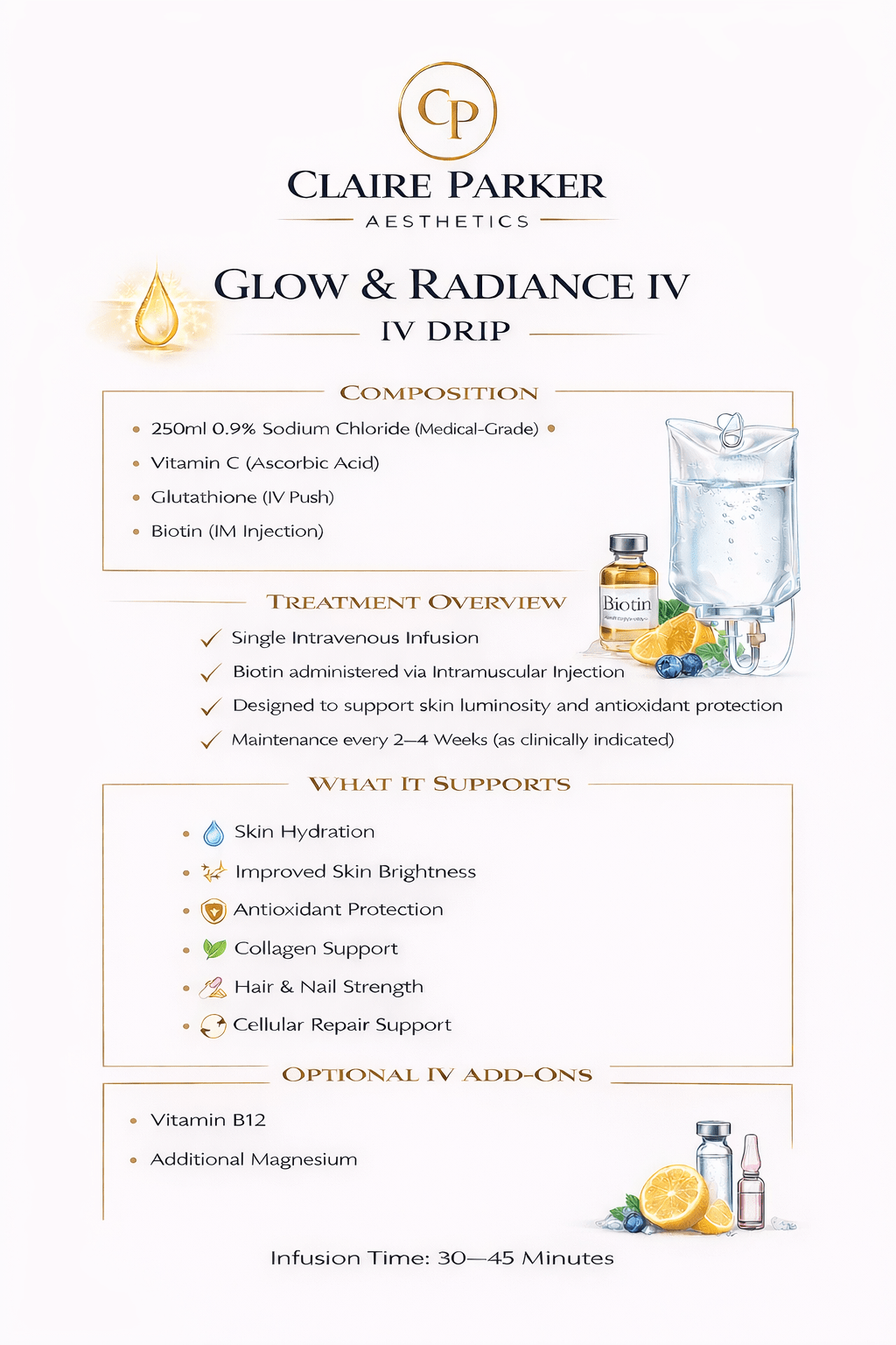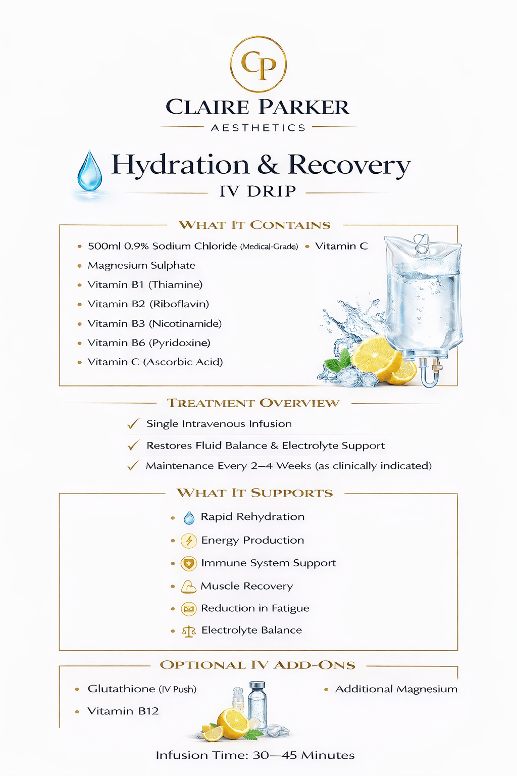 At Claire Parker Aesthetics, all intravenous therapies are prescription-only treatments delivered following a full medical consultation and clinical assessment.