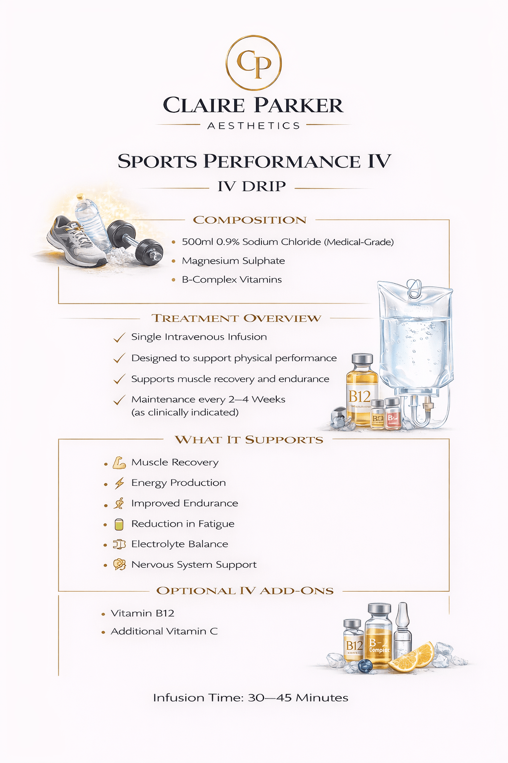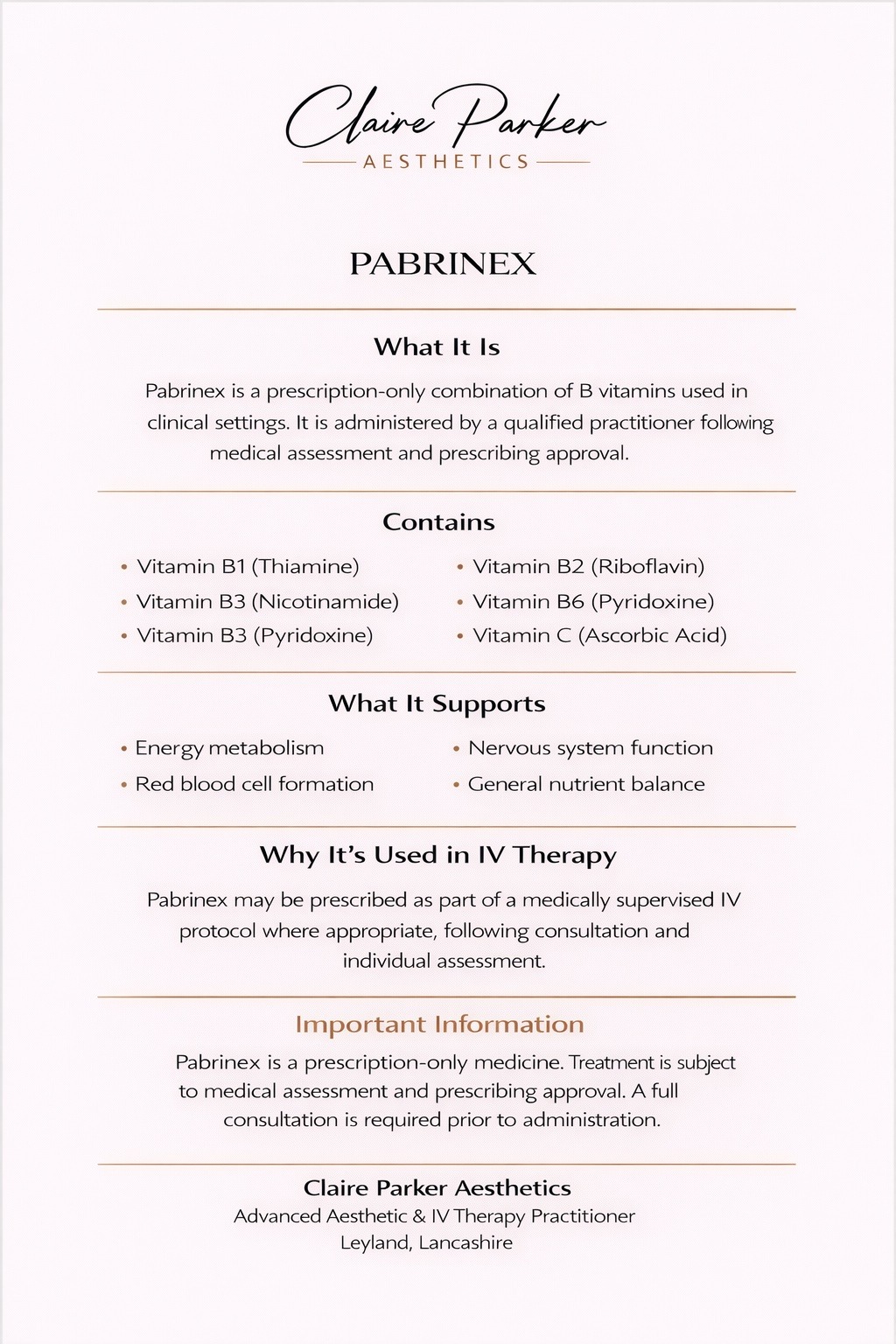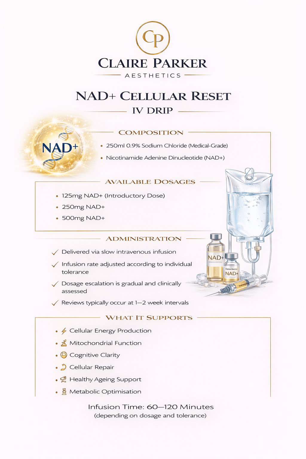 At Claire Parker Aesthetics, all intravenous therapies are prescription-only treatments delivered following a full medical consultation and clinical assessment.