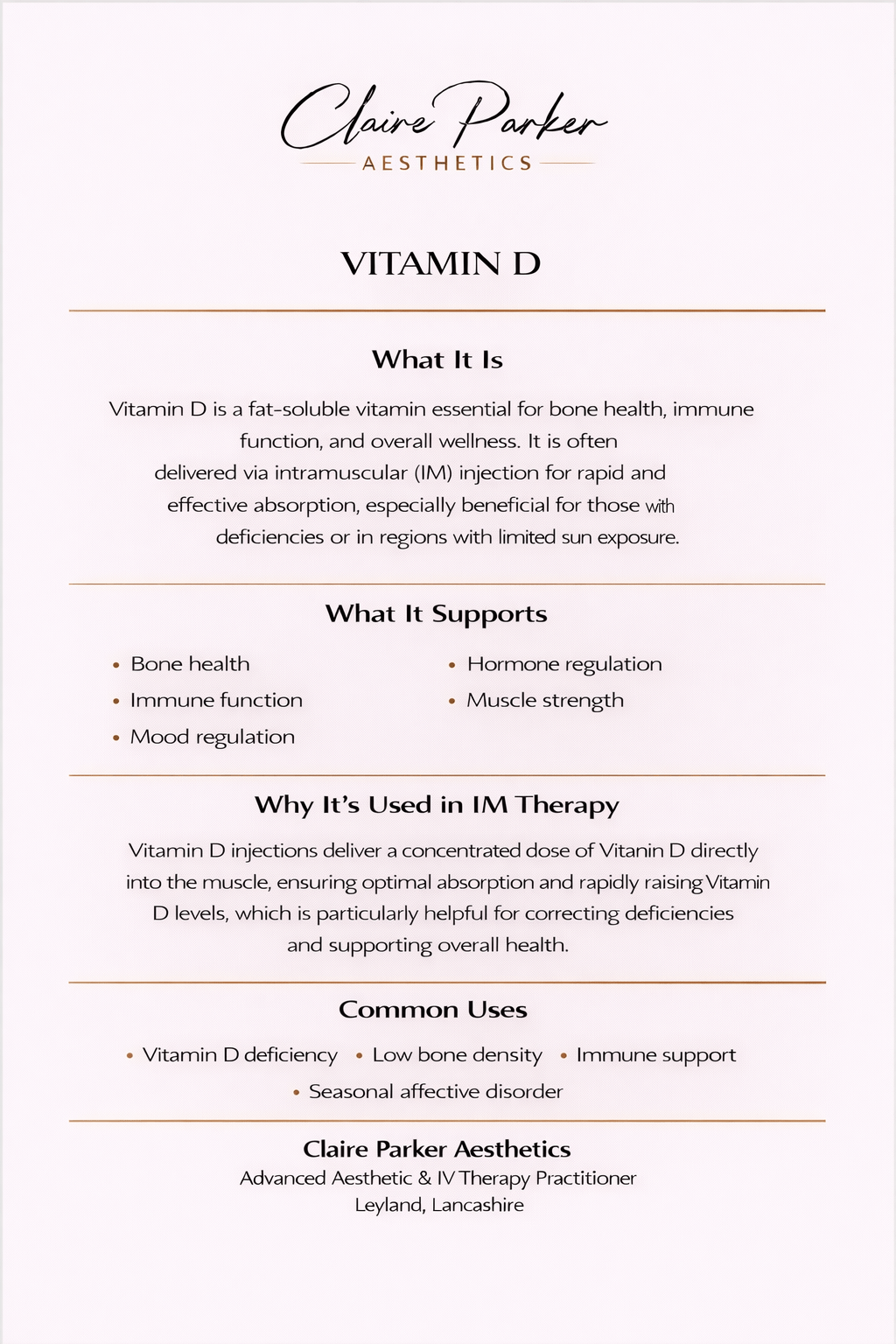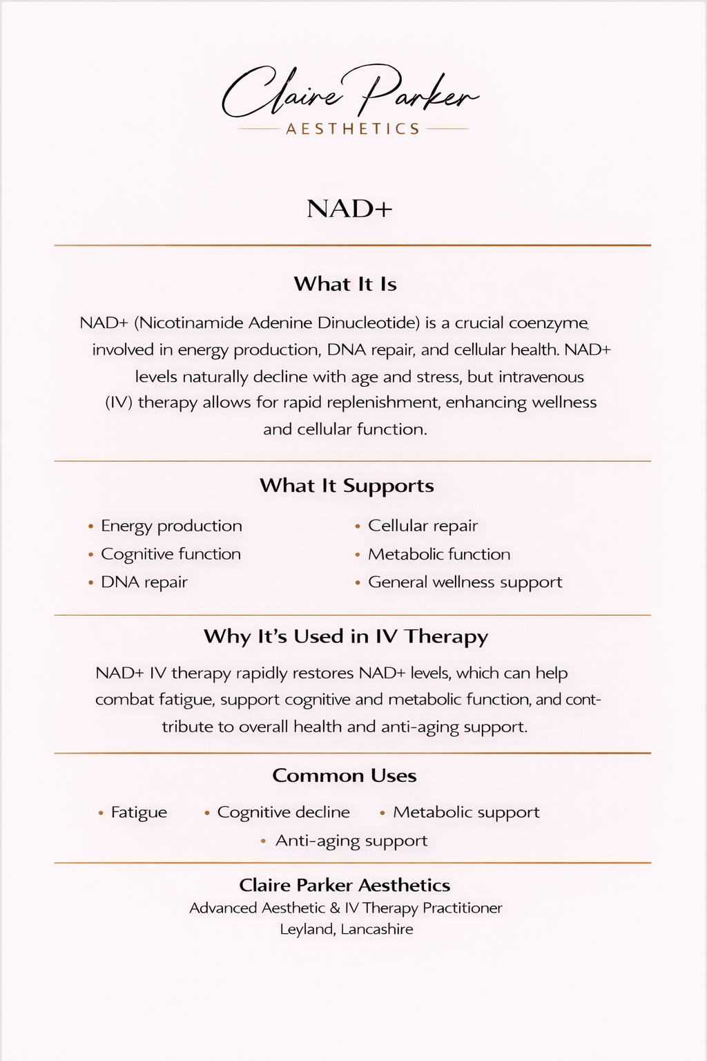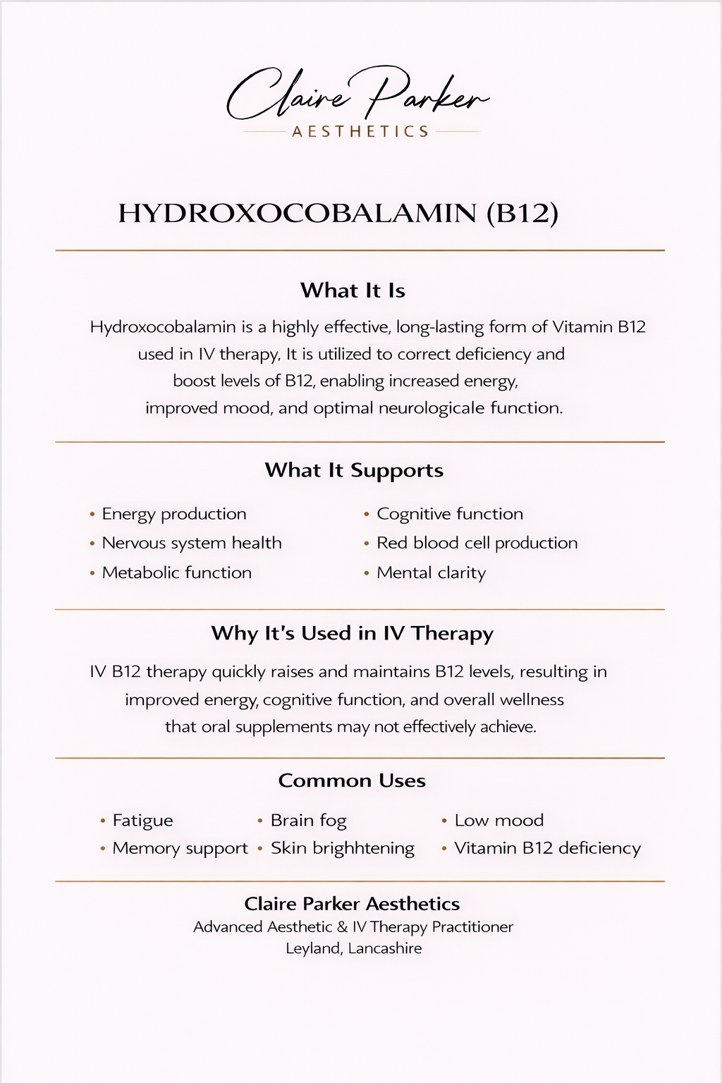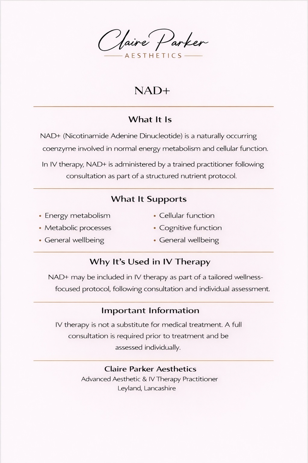 At Claire Parker Aesthetics, all IV treatments are administered in a clinical setting following full consultation and health screening.