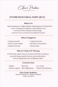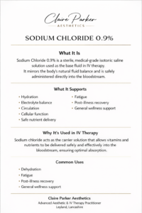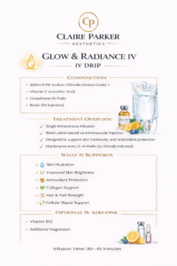 At Claire Parker Aesthetics, all IV treatments are administered in a clinical setting following full consultation and health screening.