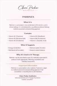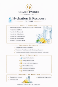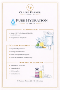 At Claire Parker Aesthetics, all intravenous therapies are prescription-only treatments delivered following a full medical consultation and clinical assessment.